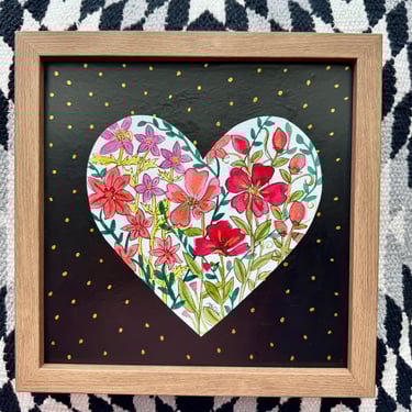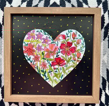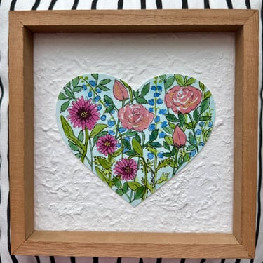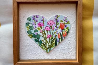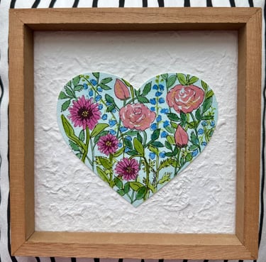 Just a sweet little Valentine-or ANYTIME- extra! (But hearts and flowers are ALWAYS "in" and these never fade!) Some hang, some sit, all are shadowbox-style ready to be loved! Tiny one is 6" and they go up from there! If your favorite is SOLD, more are coming! Prices range from $15-30!