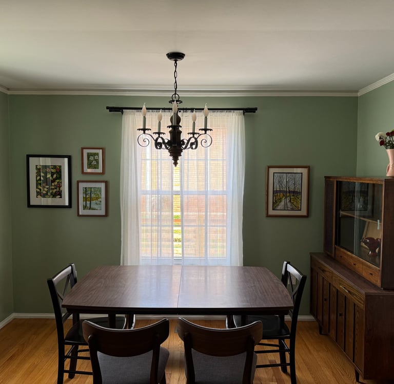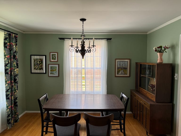 A brand-new home...a vintage vibe..and a whole wall of DeClue's Dreamscapes landscapes on nature-inspired green make for a calming peaceful dining experience! Grateful for the opportunity to be represented in this treasured family member's home!
