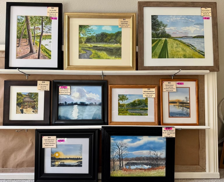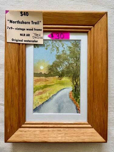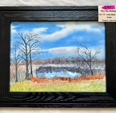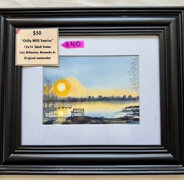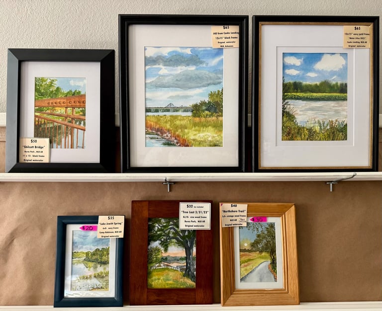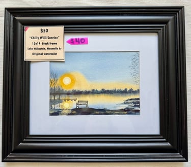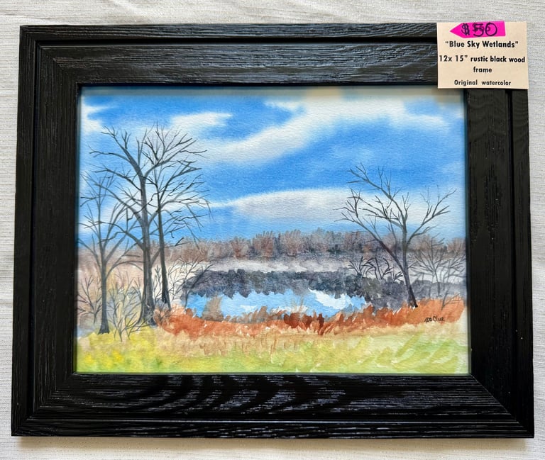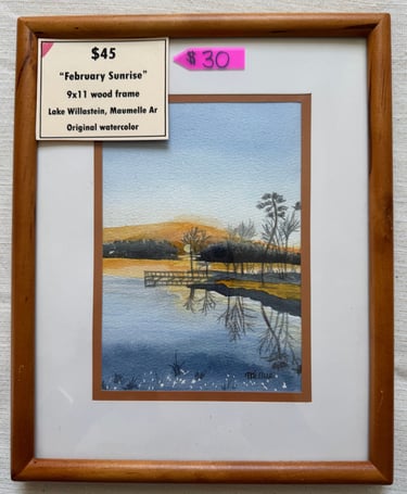 Highlighting a gorgeous orange sunset in the sky and also reflected by the water of the Central Arkansas White Oak Bayou, this piece hangs in my home and serves as a daily reminder of the quiet moments found along the trail-perfect for days when I can't be there in person. Whether you're drawn in by nature's stillness or the warmth of sunset reflections, this piece embodies the beauty of Arkansas' wetland areas. This is one of the largest I've done at 16x20" on Saunders Waterford watercolor paper.