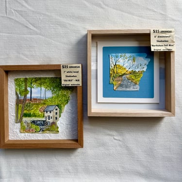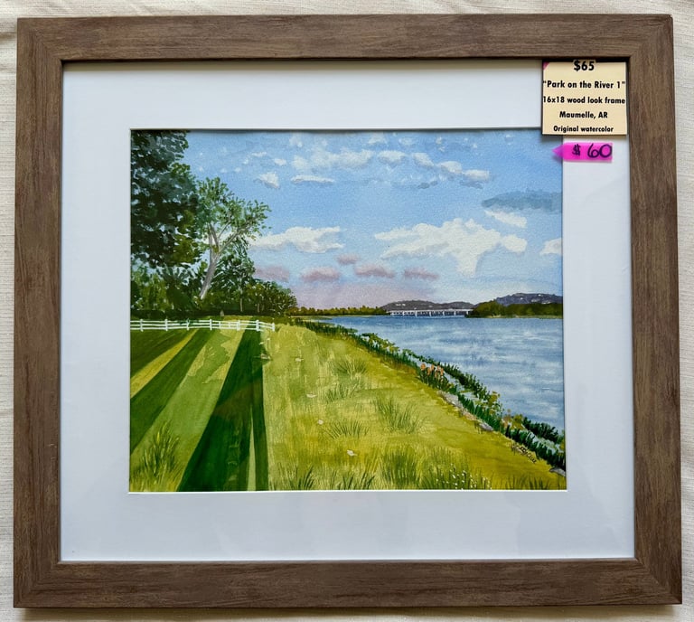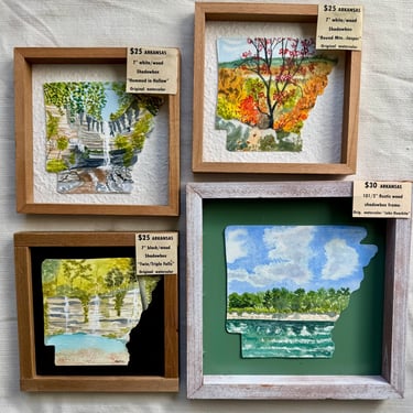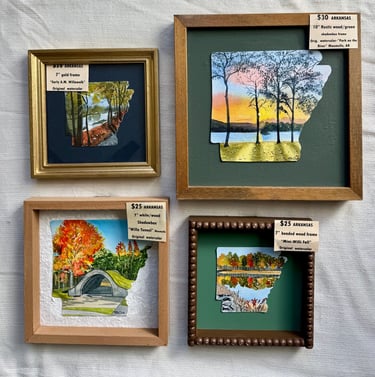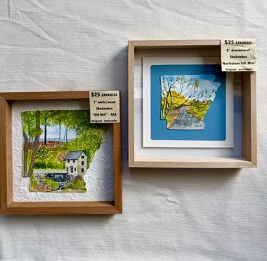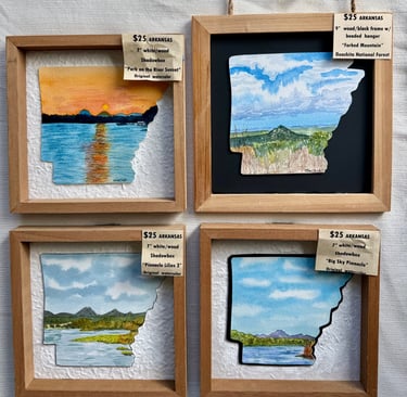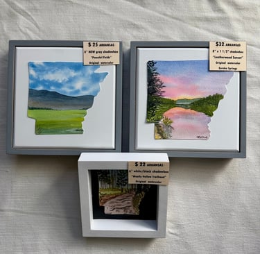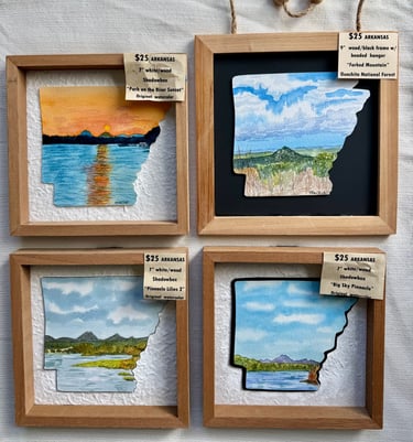 This unique Arkansas-shaped watercolor painting captures a breathtaking view from Cooks Landing in North Little Rock, looking west toward I-430 and Pinnacle Mountain. The Arkansas River, crisp blue skies, and the first signs of fall foliage create a vibrant yet peaceful scene. Painted with Daniel Smith professional watercolor paint on 100% cotton cold press paper, this one-of-a-kind piece is beautifully displayed in a shadowbox frame with a green background, adding depth and character. Love Arkansas landscapes? Commission your own custom Arkansas-shaped watercolor today!