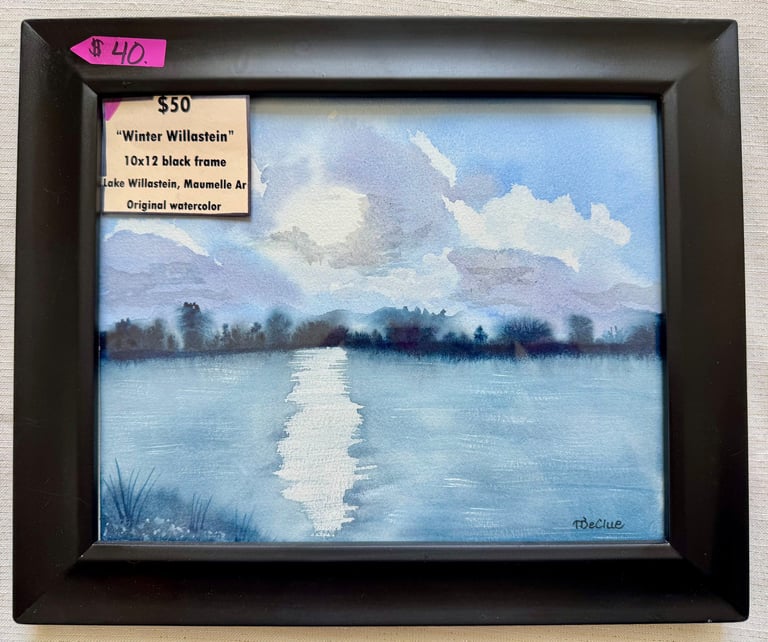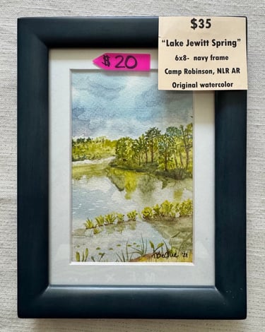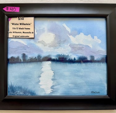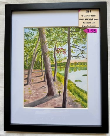 What's better than one forest of trees? TWO! A serene watercolor depicting a blue sky day and the water perfectly reflecting the gold and crimson beauty of an Arkansas fall at Lake Willastein in Maumelle. The original art is 8x10" on 100% cotton watercolor paper using Daniel Smith watercolor paint and framed in an elegant vintage oak frame.