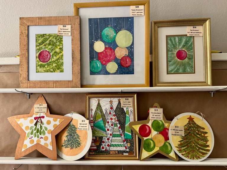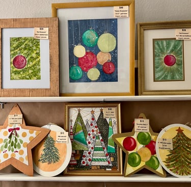 These were super fun and unique! I was going to paint with acrylic on a 9" thin wooden pumpkin cut out, but decided to mix and match with some already painted watercolor landscapes and florals! Why not? I painted the bare wood background and back a metallic bronze (or orange) and then cut landscapes to fit, protected the watercolors with acrylic spray and then affixed to the pumpkin background with matte medium. Keep scrolling to see what's NEW for 2025!