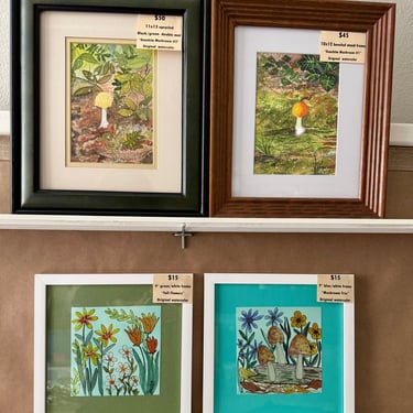 "Ouachita Mushroom #2" Yellow with polka dots? It really was! 11x13" upcycled double mat dark green and black frame $50