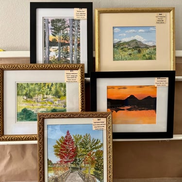 This one is still available, though! Over here doing a solo with a supporting cast of forest flora and fauna in a unique black and deep green wooden frame with an extra gold mat bringing the sparkle! In case you missed it- I LOVE to "rescue" forgotten frames from thrift stores or repurpose sale art from stores and exchange the mass produced print for original art. You can always reframe, though!